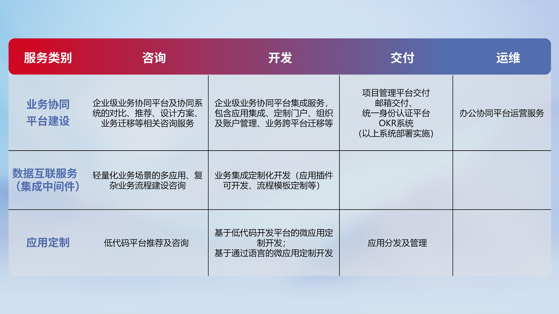 针对钉钉、、、企微、、、IDaas等平台级产品提供产品的规划、、、、方案、、、、交付、、、、定制化开发等服务,,,,实现如统一协同办公、、、、智能客户服务、、、、混合会议管理、、、智能数据查询、、、等业务场景,,实现数字化转型。。。。