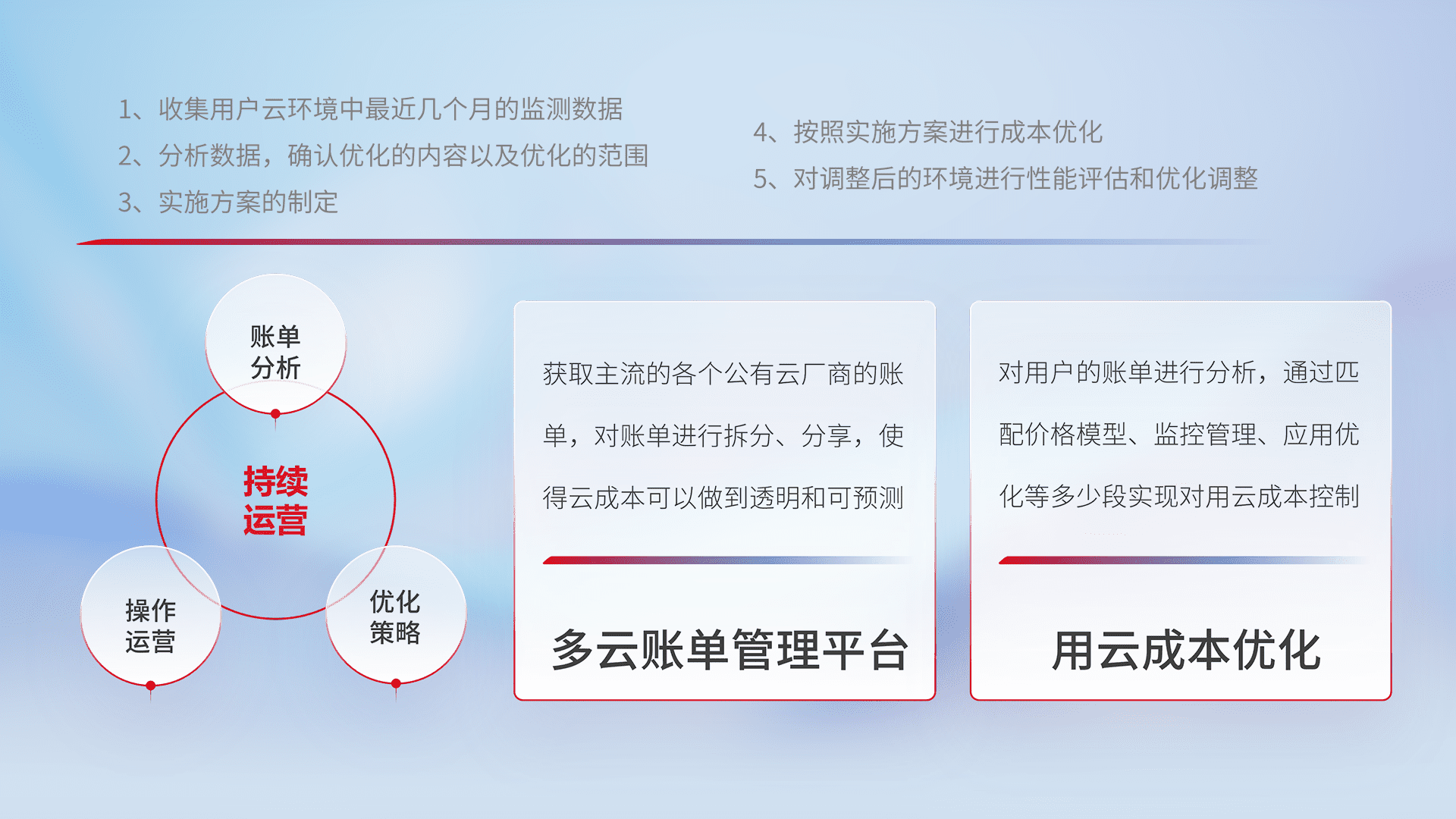 通过多云纳管,,,以统一的资源数据模型把客户的云资源进行抽象和封装,,进而实现对多云资源的统一操作,,,,保障云资源管理的可靠性、、、稳定性与可用性。。量身定制化运维内容,,,配置、、、、开发运维、、补丁管理、、、备份、、、、监控、、、认证和访问管理、、、、审计和日常巡检等,,保障在用云过程中的可靠度,,,稳定度以及高可用率。。。。